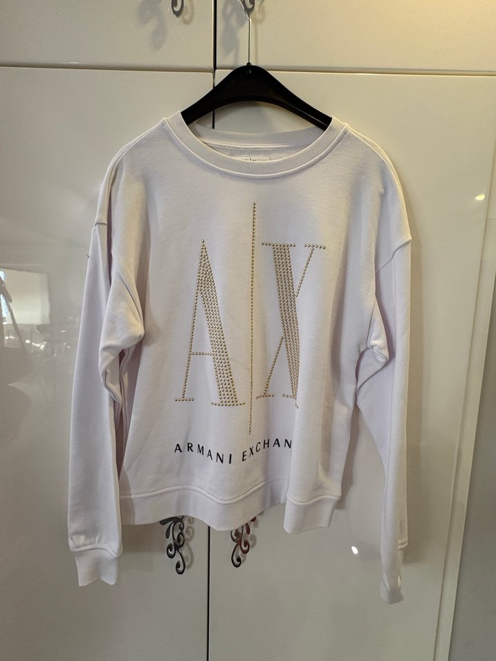 Bir kez giyildi.Beyaz, uzun kollu, yuvarlak yaka, pamuklu Armani Exchange sweatshirt. Örme kumaş ve baskılı detaylarla günlük kullanıma uygun.