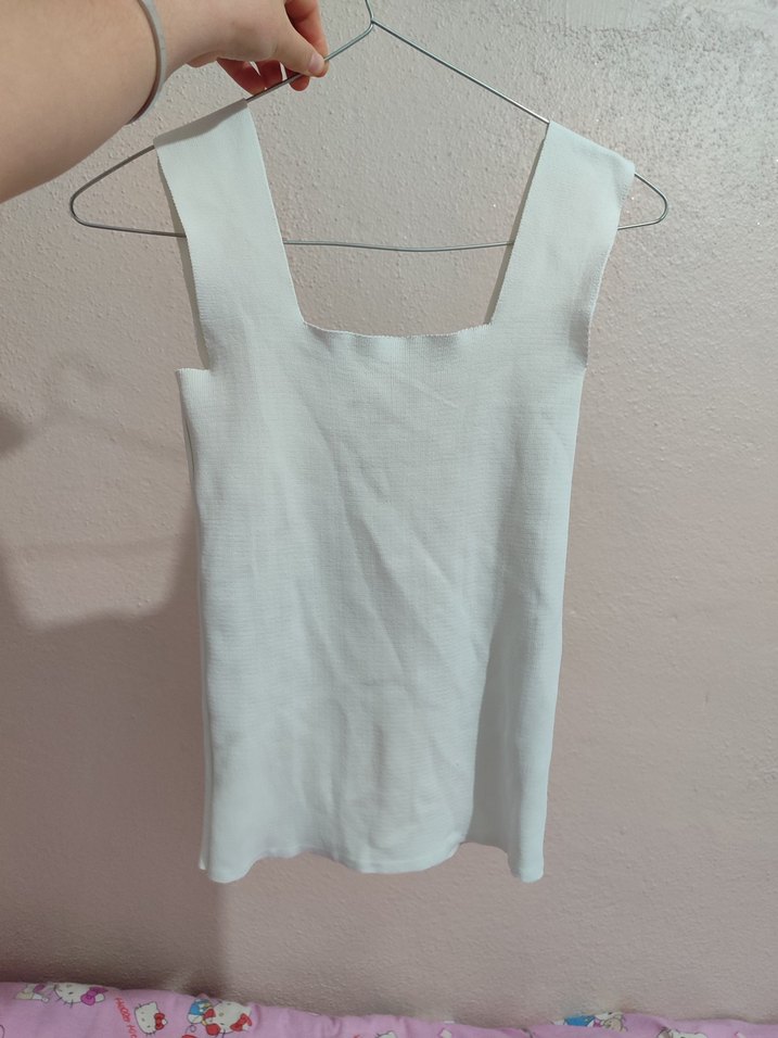 Beyaz , düz yakalı ve vücuda oturan askılı bluz, minimal ve şık bir günlük kullanım ürünü.
