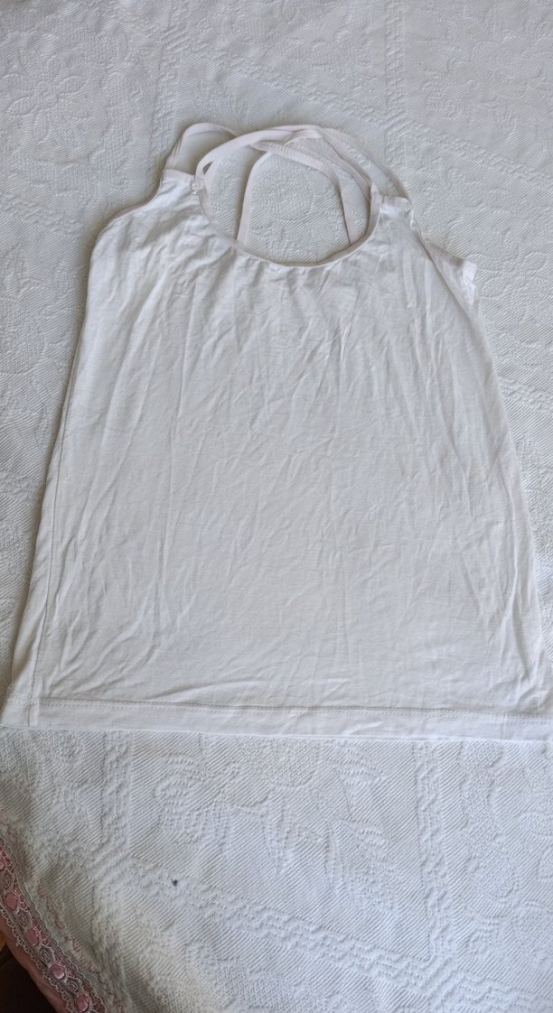 Yumuşak ve rahat kumaştan yapılmış, düz beyaz kadın atleti. Yuvarlak yakalı sade tasarım.