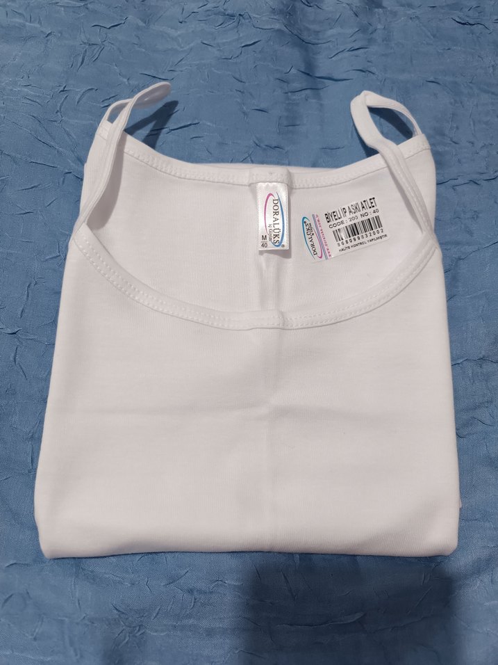 Yumuşak kumaştan, ince askılı beyaz kadın atlet, rahat kullanım için uygun.