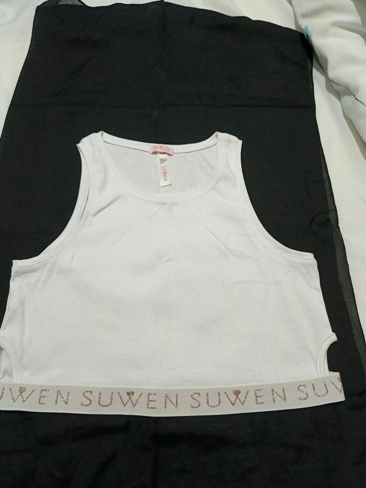 Beyaz, kolsuz ve kısa kesim kadın atlet, yumuşak sentetik kumaştan üretilmiş, şık ve spor görünümlü.suwen marka