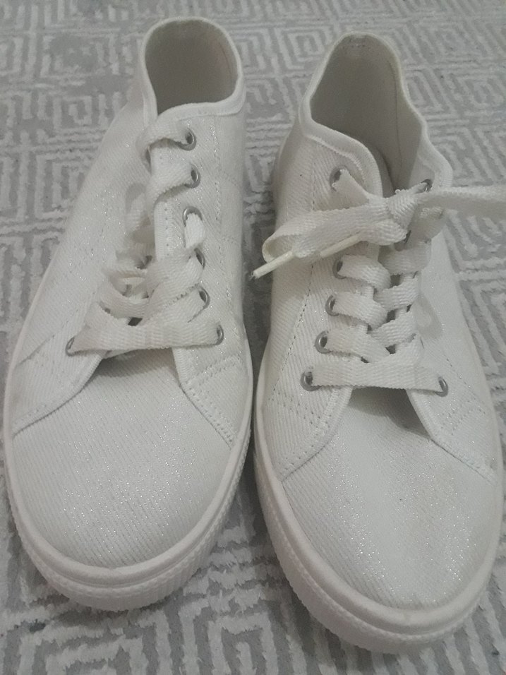 Düz tabanlı, bağcıklı beyaz kadın spor ayakkabısı. Kumaş üzerinde hafif parlaklık var. Minimalist sokak tarzına uygun, günlük kullanıma ideal.