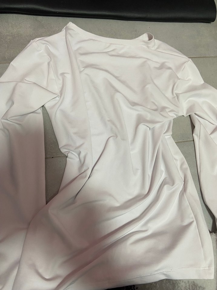 Beyaz, balıkçı yaka ve uzun kollu, vücuda oturan kadın tişörtü. Düz ve desen içermeyen, günlük kullanım için uygun sentetik kumaştan. Biraz ic gosteriyor