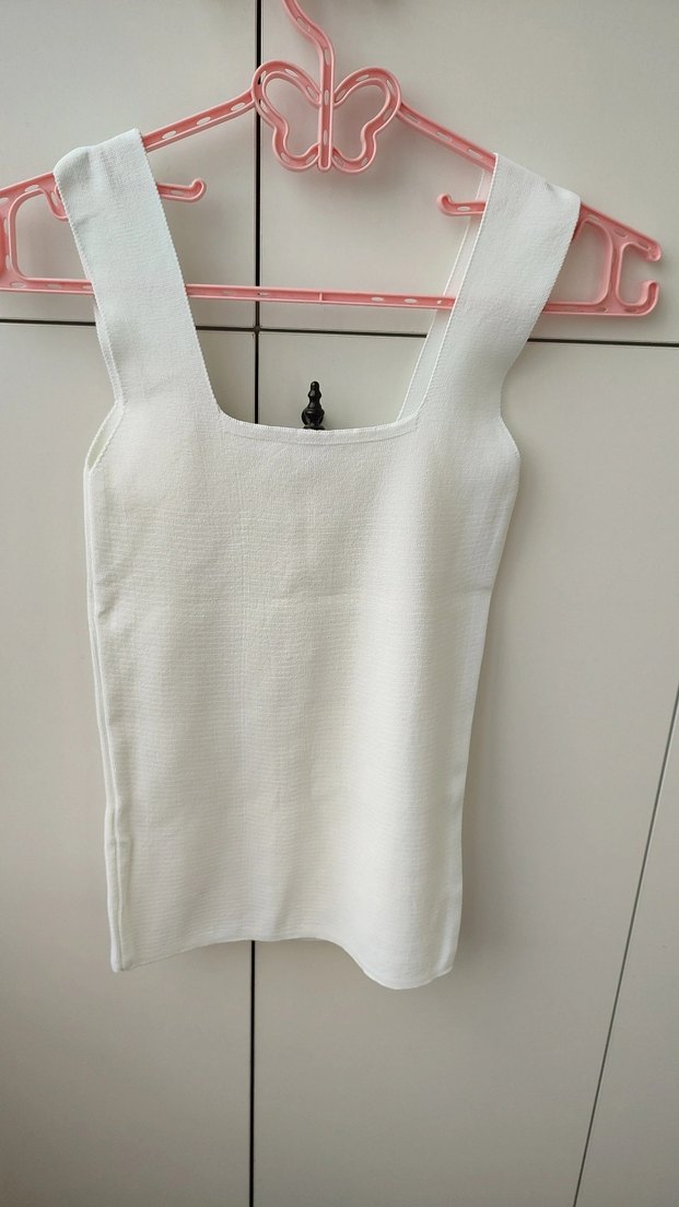 Beyaz, askılı, düz yakalı ve midi boyda, vücuda oturan kadın buluz. Düz ve sade tasarım, hafif sentetik kumaştan üretilmiştir. kumaşı çok güzel yaz kış kullanımına uygun. iç giyim olarak da dış giyim olarak da kullanilabilir