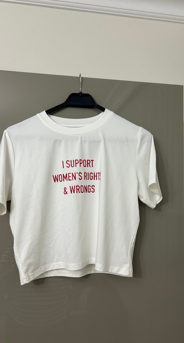 Beyaz renkli, kısa kollu ve bisiklet yaka kadın tişörtü, önünde baskılı cesur mesaj bulunur. Sentetik ve hafif kumaştan, kısa kesim ve sokak stiliyle tasarlanmıştır.