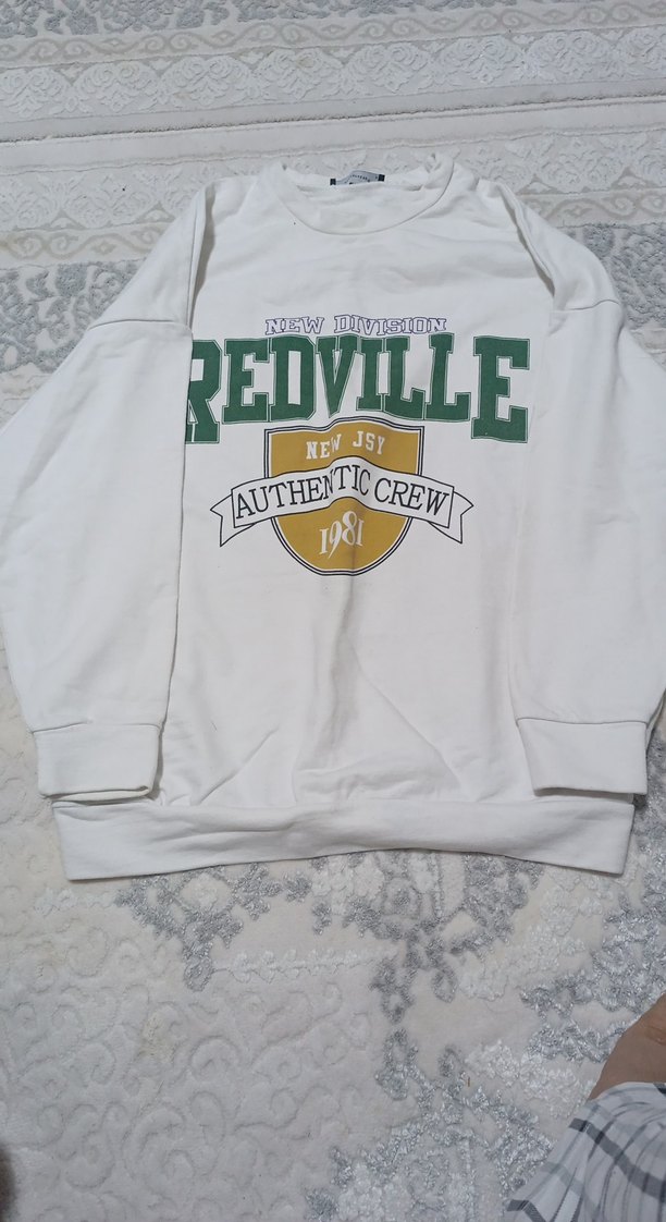 Beyaz pamuklu sweatshirt, bisiklet yaka, uzun kollu ve bol kesimdir. Üzerinde baskı ve fırfır detayları bulunur. Günlük kullanıma uygundur.