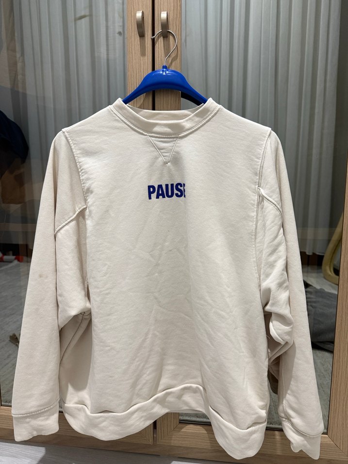 Beyaz renkli, yuvarlak yaka ve uzun kollu, bol kesim sweatshirt. Önünde "PAUSE baskısı bulunur. Günlük kullanıma uygun, rahat ve şık bir parça. Normalde uzundu tunik modeldi kısalttım kolundaki lekesi çıkar