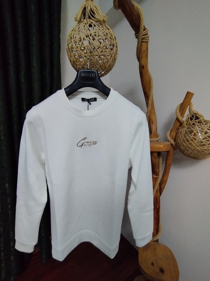 Beyaz örgü pamuklu sweatshirt, yuvarlak yaka ve uzun kollu. Önünde parlak baskı deseni bulunur, rahat ve kısa kesimdir. Günlük sokak stili için uygundur. m l xl bedenleri vardır ayrıca füme rengi de var