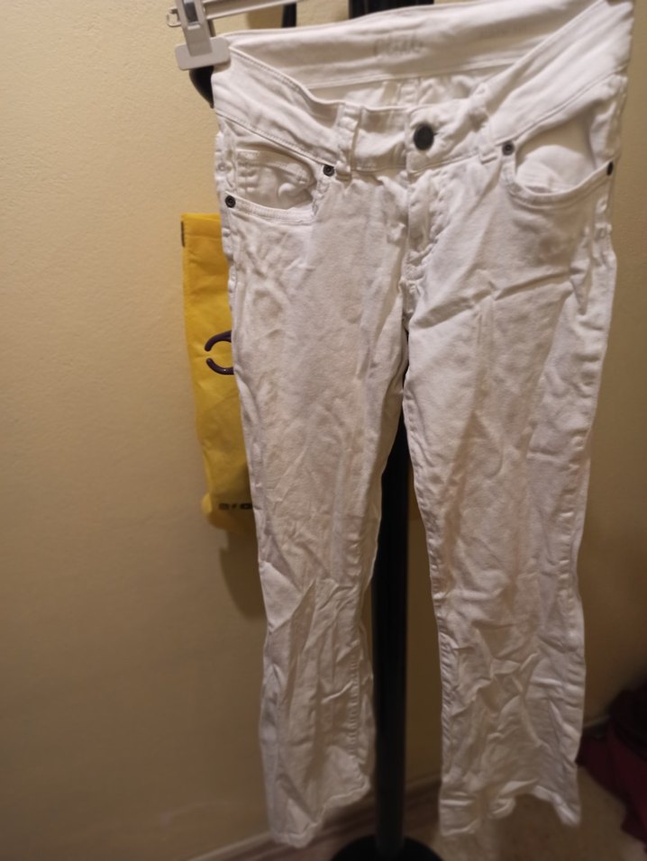 Beyaz pamuk kumaştan, bel bantlı, midi boy, normal kesim kadın pantolonu. Günlük kullanıma uygun rahat sokak stili pantolon.
