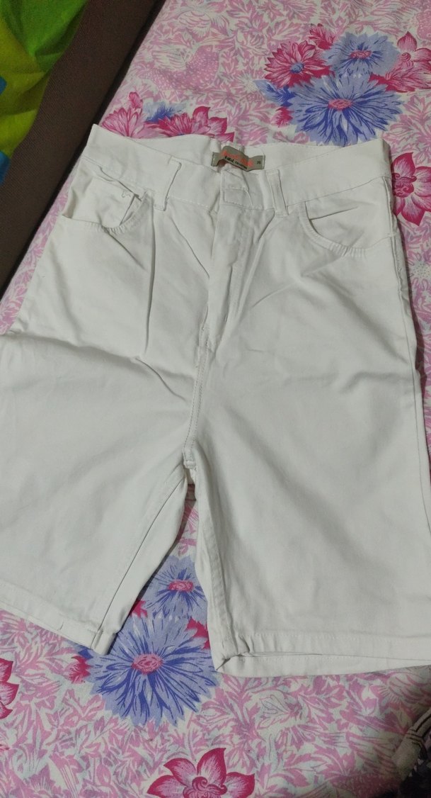 Beyaz renkli, pamuk kumaştan, bol kesim kadın bermuda şort, günlük kullanım için rahat ve şık bir sokak tarzı sunar.