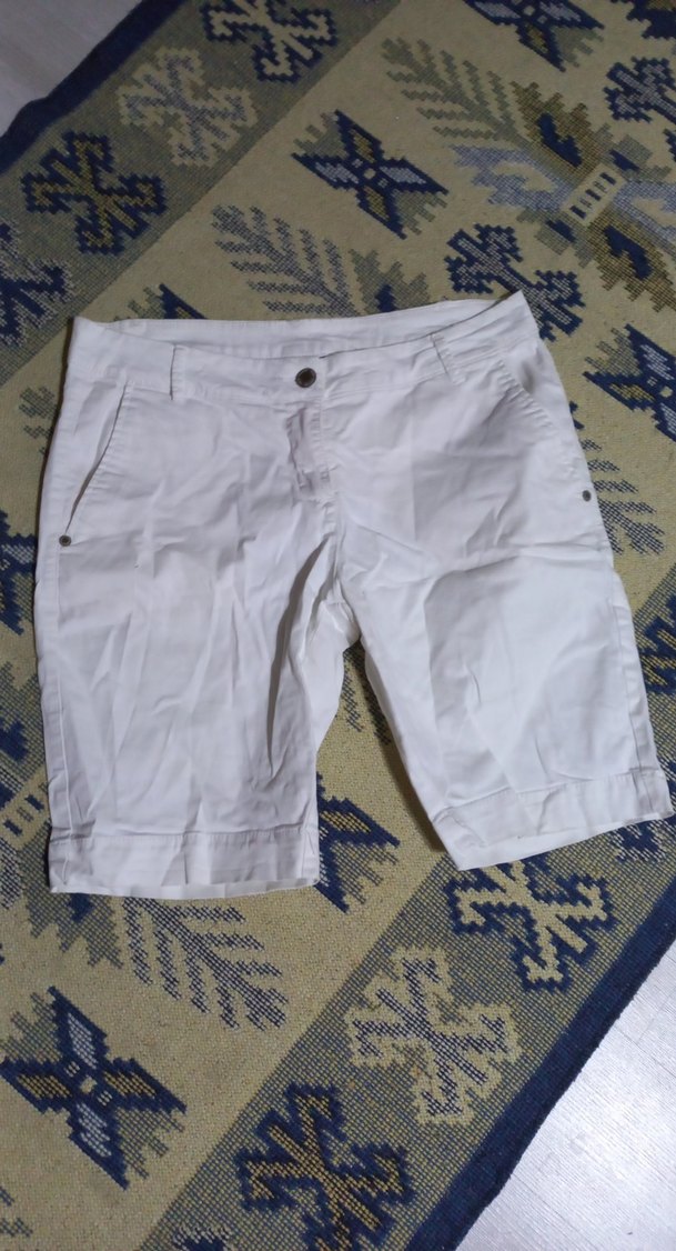 Beyaz pamuklu, bol kesim kadın Bermuda şort, günlük kullanım ve rahat sokak stili için uygun. Zahmetsiz şıklık sunar.