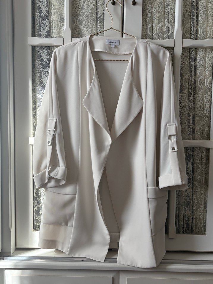 Aker marka drapeli önü ve kesik yakalı beyaz kadın blazer. İpek dokulu, midi boyda, ofis için uygun klasik şıklıkta rahat kesim ceket S beden. Kesimi geniş M bedene de uyacaktır. Hiç kullanılmadı artık beklemesin eminim birine yakışacaktır. Ölçüler En:50cm Boy:80cm
