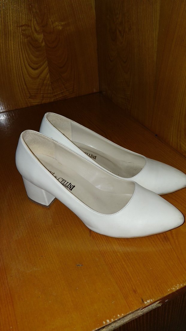 Beyaz, blok topuklu kadın stiletto, düz ve desensiz tasarıma sahip, kauçuk malzemeden üretilmiştir. Ofis için zarif ve rahat şıklık sunar. 1 kere tek giyildi temiz kullanıldı