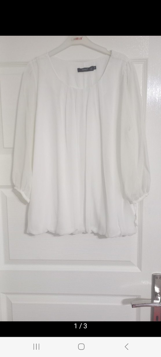 Beyaz , kayık yaka ve kısa kollu, salaş kesim midi boy bluz. Minimalist ve çağdaş tarzda, ofis için uygun.