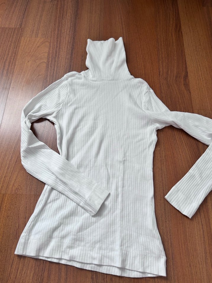 Beyaz, boğazlı ve uzun kollu kadın kazak, ince triko dokusu ve keten kumaştan üretilmiştir. Günlük kullanıma uygun sade ve rahat bir tarza sahiptir.