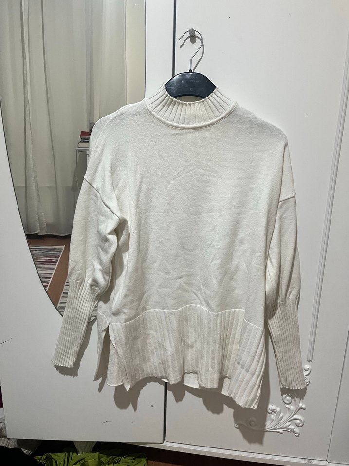Beyaz boğazlı, uzun kollu kadın triko kazak. Yumuşak örme kumaştan, midi boyda, salaş kesim ve desensiz, rahat sokak stiline uygun. Hiç kullanılmadı, geniş beden, s-m giyebilir