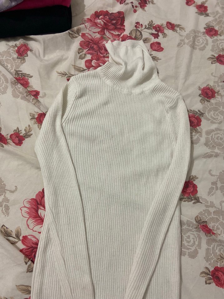 Fitted kesim, beyaz renkli, boğazlı ve uzun kollu örme triko kazak, rahat ve şık günlük kullanım için uygun.