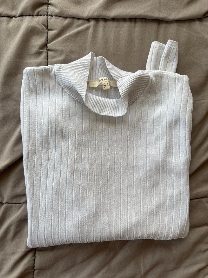 Beyaz, boğazlı ve uzun kollu, yumuşak keten kumaştan örülmüş, normal boyda ve düz desenli, rahat kesim kadın triko kazak.