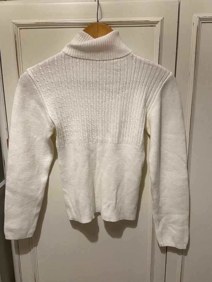 Beyaz boğazlı triko kazak, vücuda oturan kesim ve örme doku Uzun kollu, midi boyda, sade ve rahat bir tasarıma sahiptir. xs beden defosu yok