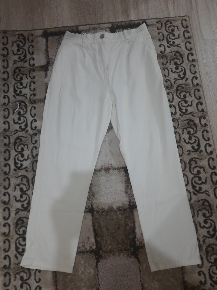 Midi boy, beyaz pamuk kumaştan yapılmış bol kesim kadın pantolon. Günlük kullanıma uygun, desen içermeyen rahat ve şık bir tasarıma sahiptir.