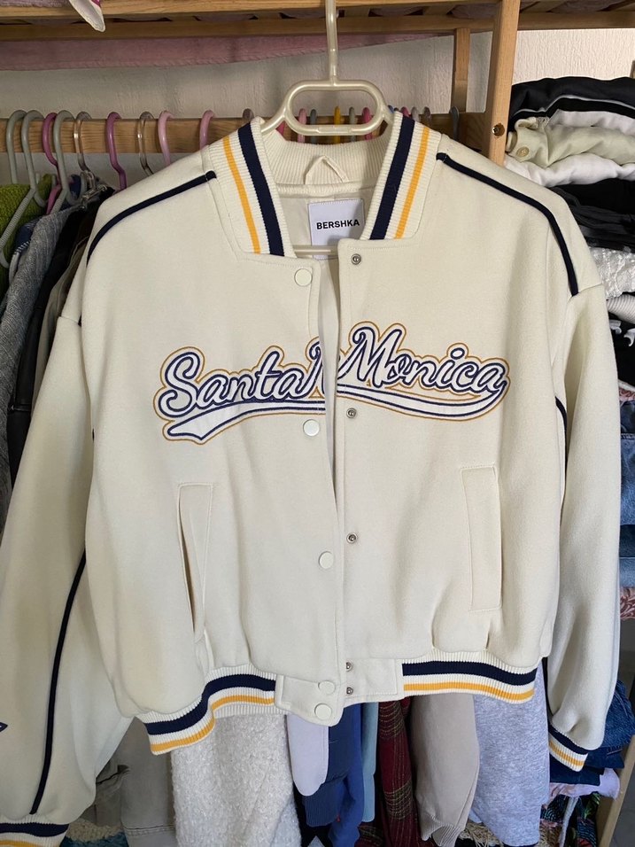 Düğmeli önü, uzun kollu ve bol kesimli beyaz bomber ceket. Yumuşak fleece kumaş ve Santa Monica baskısı ile günlük kullanım için uygundur.