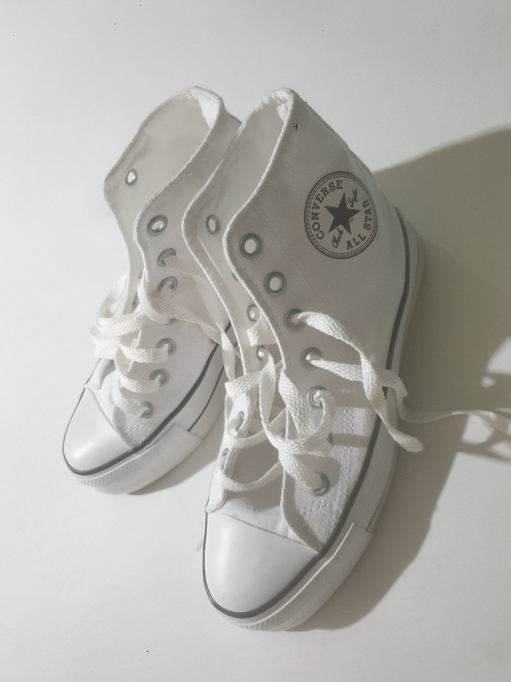 Beyaz Converse kadın spor ayakkabısı, düz kauçuk tabanlı, minimalist tasarımlı, günlük kullanım için zahmetsiz şıklık sunar.