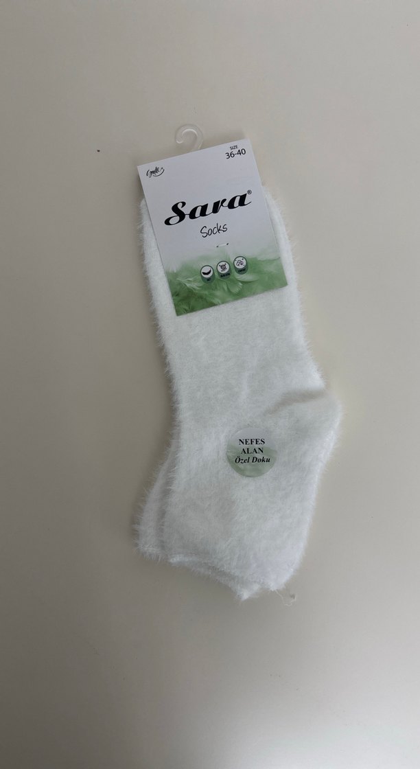 Yumuşak ve sıcak dokulu, beyaz renkte, desensiz kadın çorabı. Numara 36-40, marka Sara.