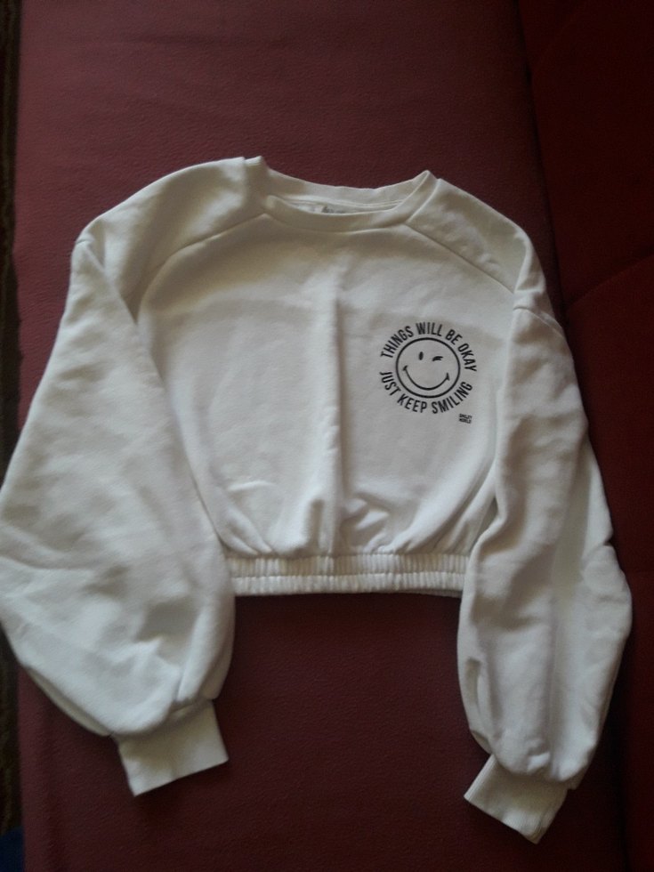 baskılı gülümseme deseniyle beyaz, uzun kollu, bol kesim crop sweatshirt. Yumuşak kumaştan üretilmiştir.