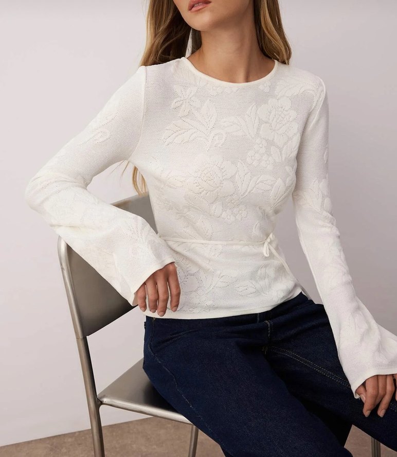 Beyaz triko kumaştan, çiçek nakışlı ve dantel detaylı, yuvarlak yaka, uzun kollu, normal boyda, rahat kesim günlük kadın bluz.