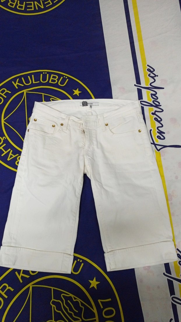 Beyaz renk, regular fit denim bermuda şort. rahat ve şık sokak stili için uygun. Outdoor kullanıma uygun. ufak bir lekesi var ama geçmeyecek bir leke deil
