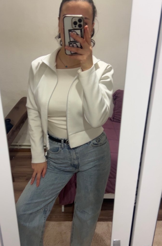Beyaz renkte, uzun kollu ve yüksek yakalı kadın denim ceketi, midi boyda ve vücuda oturan kesimle günlük şıklık sunar. Teklif sunabilirsiniz