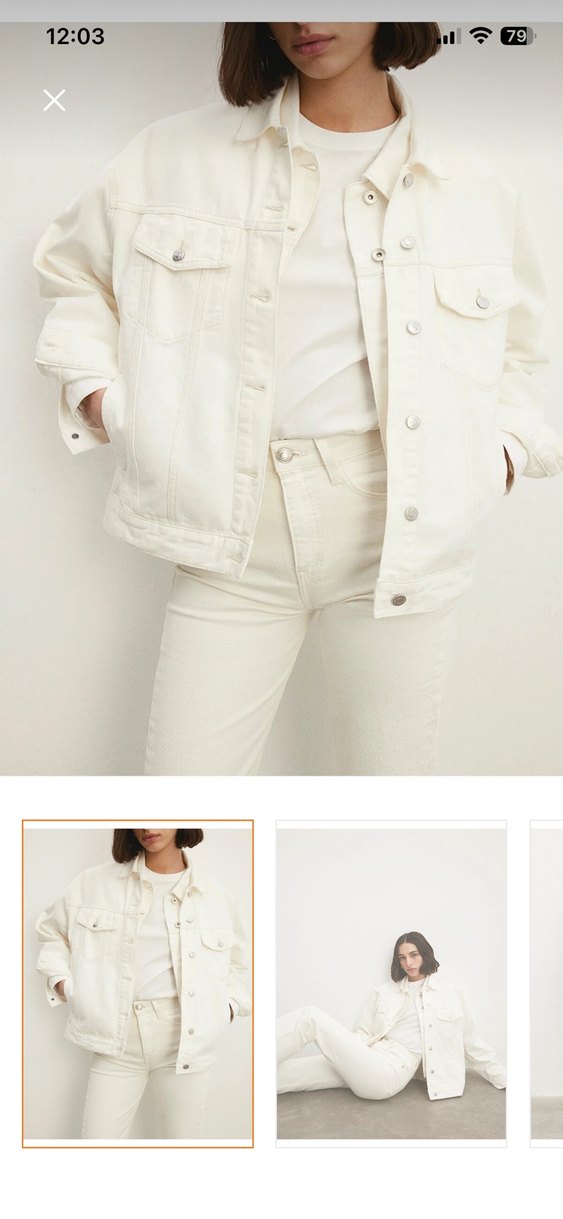 Beyaz pamuk denim ceket, rahat kesim, yakalı ve uzun kolludur. Minimalist ve desensiz tasarımıyla günlük sokak stiline uygun, zahmetsiz şıklık sunar.
