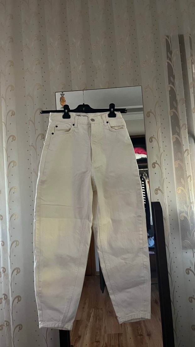 Beyaz midi uzunlukta, bol kesim ve rahat şıklık sunan denim pantolon, günlük sokak stili için uygundur. 45 kiloyum ona rağmen belinde bolluk var