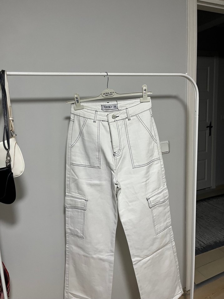 Beyaz denim pantolon, rahat kesim ve bol bkullanışlı cepleri ve sade tasarımıyla günlük sokak stiline uygun.