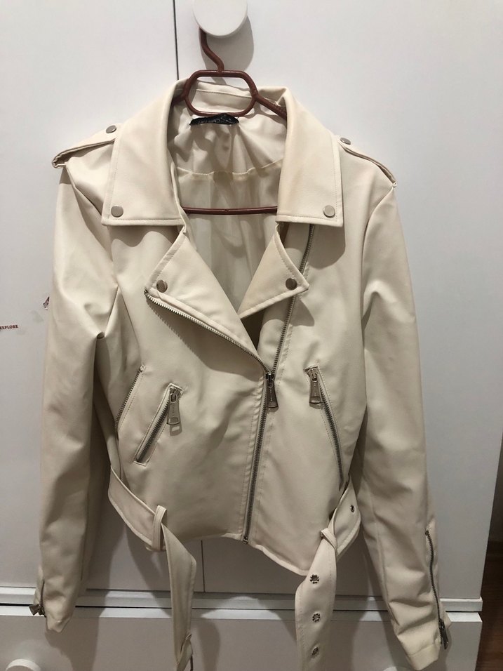 Fitted beyaz deri ceket, kesik yakalı ve tokalı detaylara sahip. Kayışlı kollu, normal midi boyda ve desen içermeyen günlük kullanıma uygun şık tasarım.
