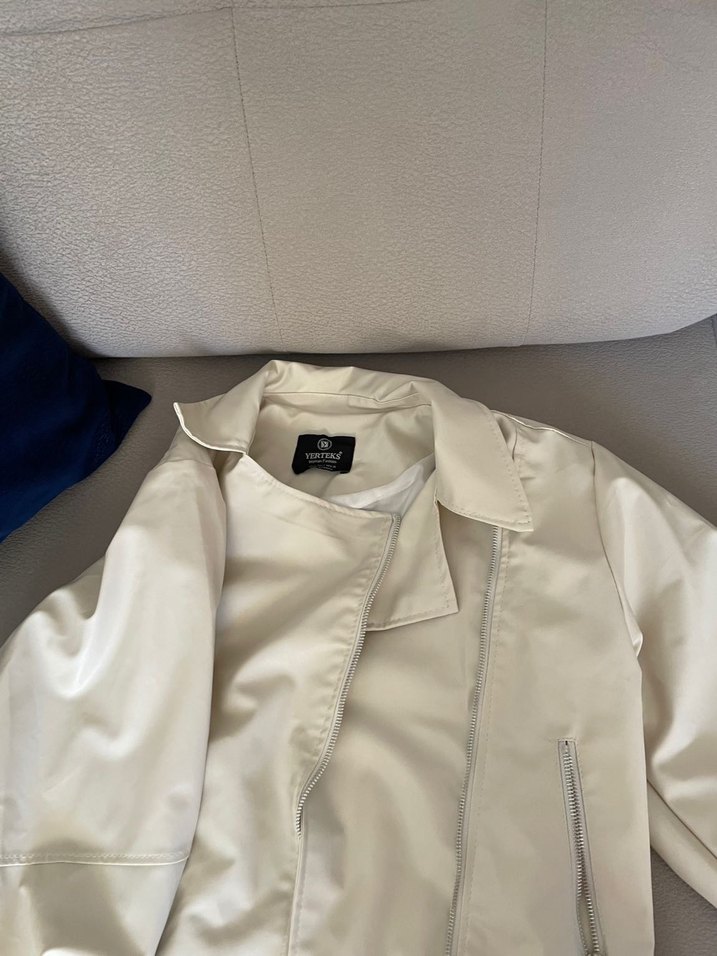 Beyaz kadın deri ceket, notalı yaka ve fermuarlı ceplere sahiptir. Sentetik kumaştan, midi boyda ve regular fit kesimlidir. Minimalist sokak stili için uygundur.
