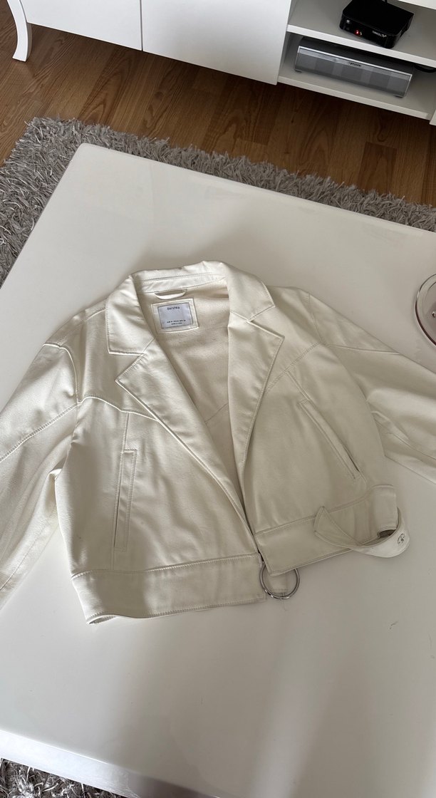 Beyaz deri ceket, notched lapel yaka ve askılı kollarla sade ve şık. Normal boy ve regular fit, günlük kullanıma uygun minimal tasarım.