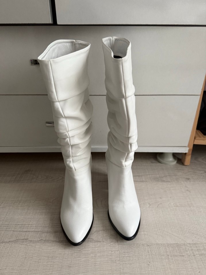 Beyaz deri dizüstü çizme, stiletto topuk ve pilili detaylara sahip. Minimalist, çağdaş ve günlük kullanıma uygun trend rahat tarzda.
