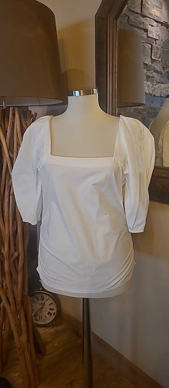 Beyaz pamuklu bluz, tekne yaka ve kısa kollu, bol kesimdir. Dökümlü tasarımıyla midi boyda, sokak modasına uygun bir parça.