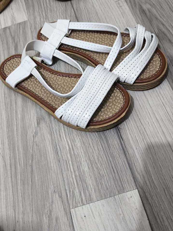 Beyaz, dolgu topuklu, tokalı kayışlara sahip, yumuşak kauçuk malzemeden yapılmış, minimalist ve retro tarzda günlük kadın sandaletleri.