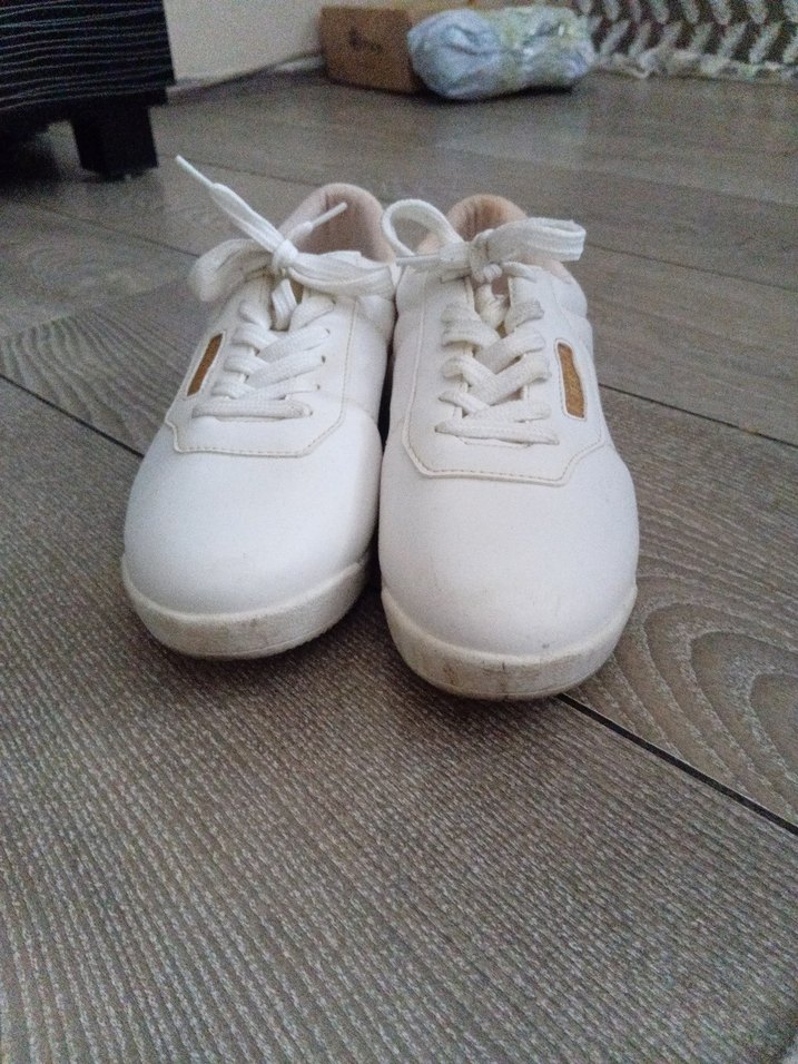 Beyaz, dolgu topuklu ve kauçuk tabanlı kadın spor ayakkabısı. Minimalist sokak stili ve zahmetsiz şıklık sunar. Günlük kullanım için uygundur.