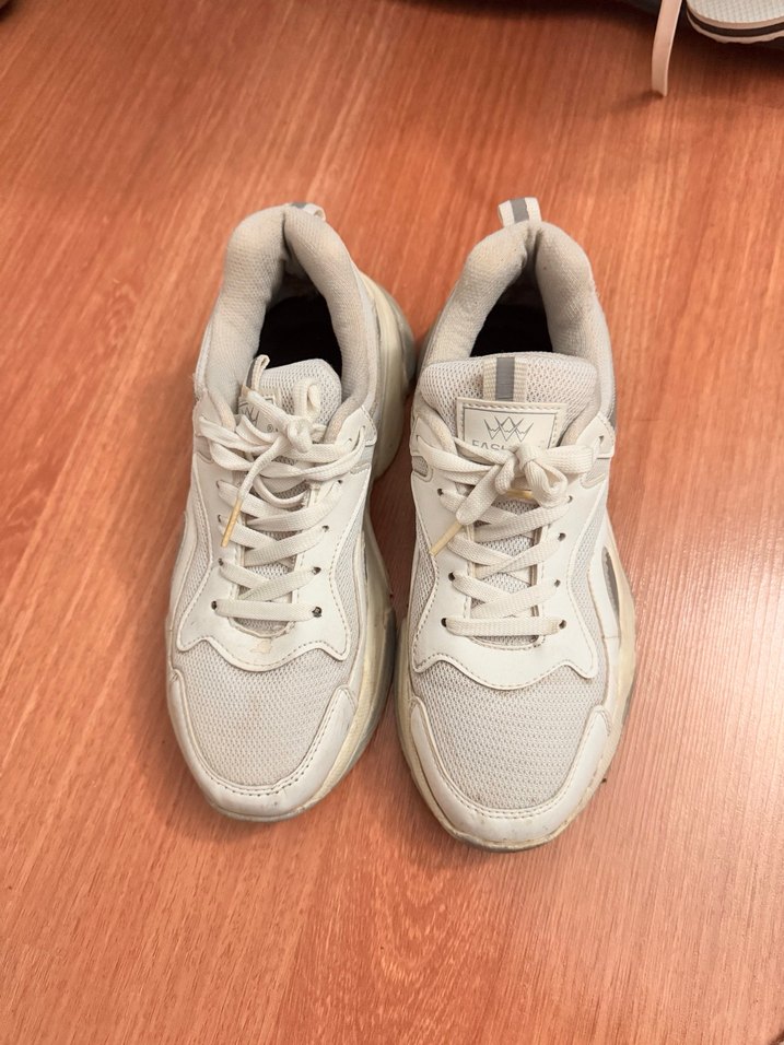 Beyaz, dolgu topuklu ve kauçuk tabanlı kadın spor ayakkabısı. Günlük kullanıma uygun, pastel tonlarda sade ve şık görünüme sahip.
