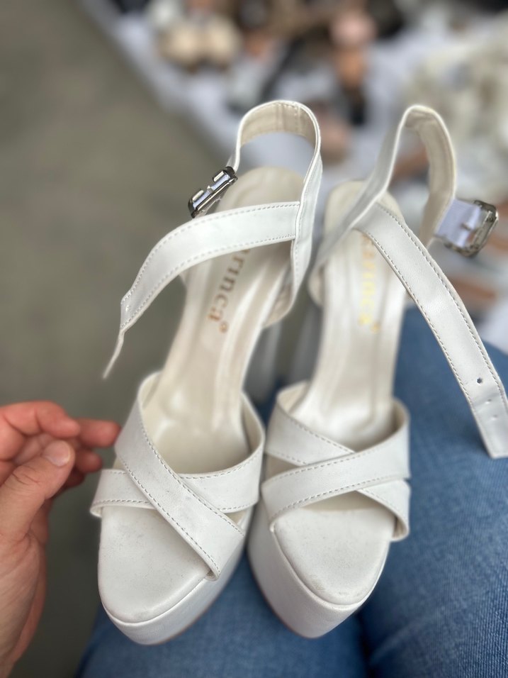 Beyaz, tokalı bantlı, deri dolgu topuklu abiye ayakkabılar. Minimalist tasarım, düğün ve sokak modasına uygundur. 36 numara 37 si de mevcuttur sıfır ürün