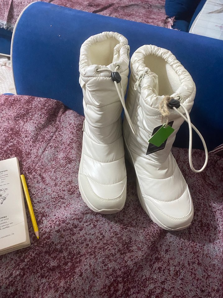 Beyaz renkli, dolgu topuklu ve fermuarlı kadın botları. Kauçuk malzemeden üretilmiş, dış mekan için rahat ve sıcak tasarım. Trend sokak stili için uygun. ❄️