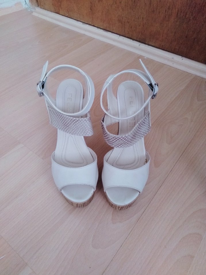 Beyaz dolgu topuklu kadın sandalet, tokalı kayışlı ve minimalist, çağdaş tasarıma sahip. Kauçuk malzemeden, düğün ve şık günlük kullanım için uygundur.