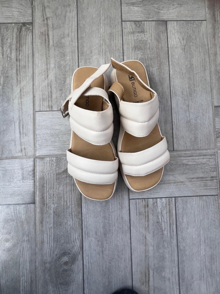 Beyaz, dolgu topuklu, tokalı bantlara sahip minimalist desen içermeyen kauçuk kadın sandaletleri, günlük rahat kullanım için uygun.