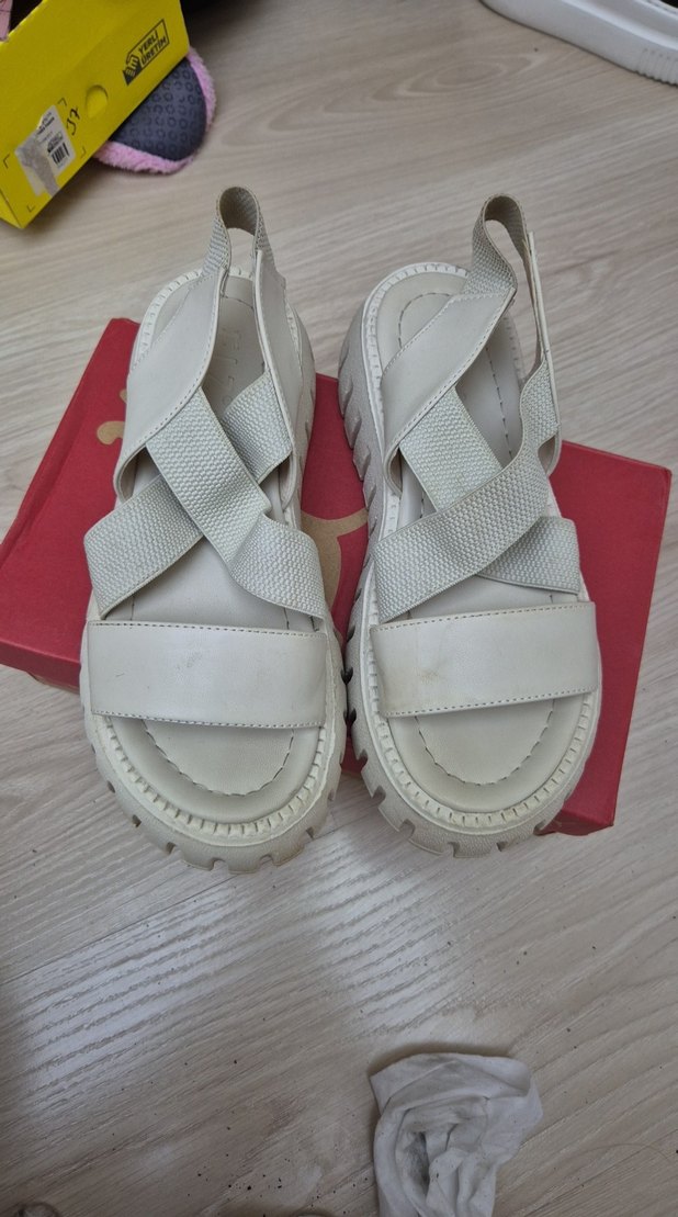 Beyaz dolgu topuklu kadın sandalet, kayışları tokalı ve kauçuk malzemeden. Minimalist ve günlük sokak tarzına uygun. sadece 1 kere 10 dk giydim.