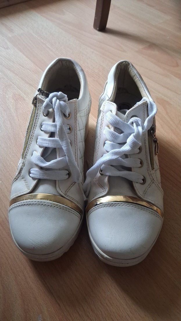 Beyaz renkte, parlak detaylı, yan fermuarlı dolgu topuklu kadın spor ayakkabısı. Kauçuk tabanlı, bağcıklı önüyle trend sokak stili için uygundur. az kullanıldı yıkanadan dolayı tekinde öndeki sarı detayda yıprnama olmuş fotoda var günlük kullanıma uygun