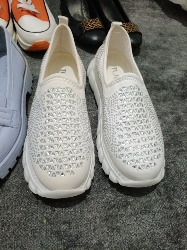 Beyaz, dolgu topuklu kadın spor ayakkabı. Lastik malzeme, pullu ve yılan desenli, trend sokak stili için uygun.