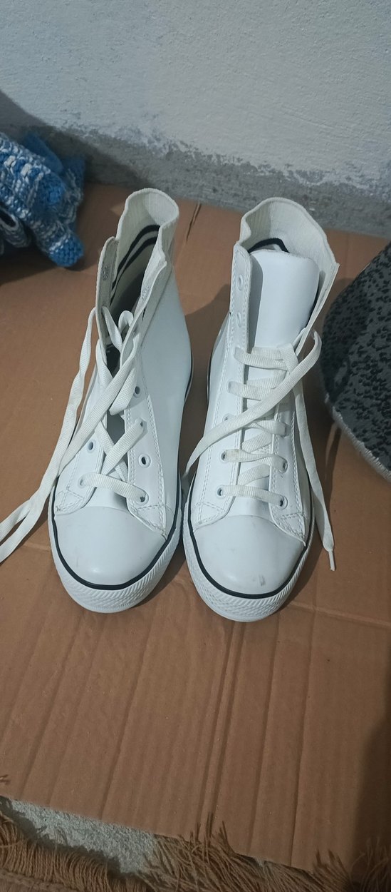 Beyaz, dolgu topuklu ve bağcıklı kadın spor ayakkabısı. Kauçuk malzemeden üretilmiş, minimalist sokak stili için uygundur. ️